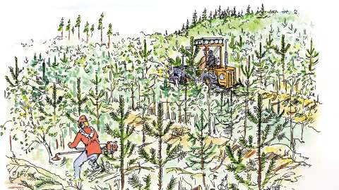Två av aggregaten avverkade hela stråket under kontinuerlig framryckning. Tidsåtgången per hektar för stråkröjning var mindre än hälften än vid selektiv motormanuell röjning. Det här beror dels på att maskinen kan arbeta effektivt i stråken, dels på att den motormanuella röjningen i mellanzonen går nästan dubbelt så fort som röjning i ett bestånd utan stråk.