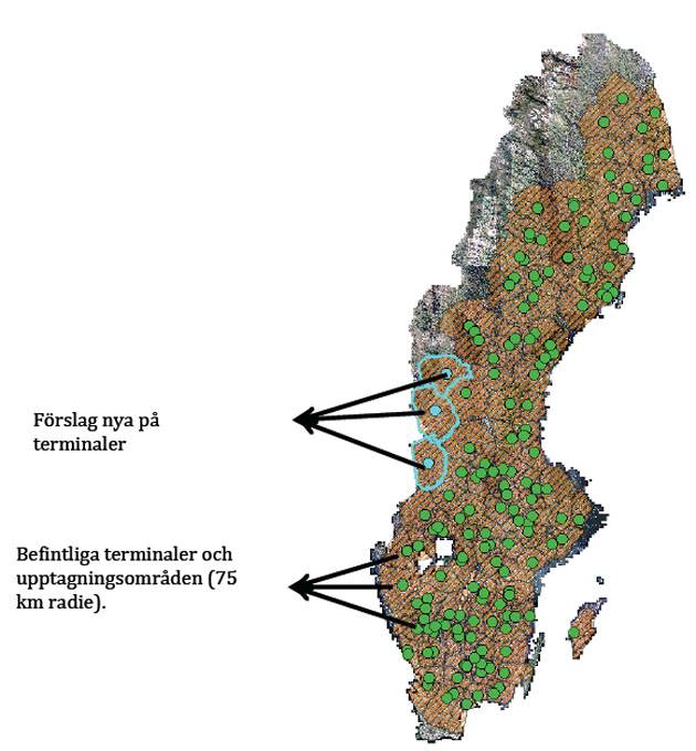 Figur 1. I nordvästra Dalarna finns områden där bränslevolymer ligger utanför terminalernas räckvidd. I övrigt är landet väl försett med terminaler.