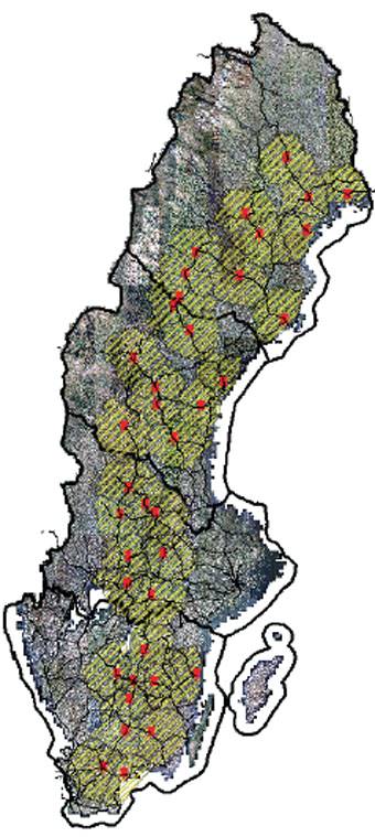 Figur 2. Järnvägsterminalerna och deras upptagningsområden. De täcker en stor del av de tillgängliga bränslevolymerna.