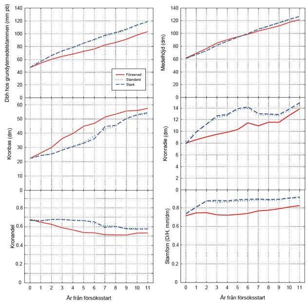 Figur 3. Utvecklingen av olika trädegenskaper under försöksperioden för de fem björkdominerade bestånden. År 0 gjordes en röjning i standard och stark röjning, år 5 röjdes de försenade bestånden och år 8 gjordes en röjning i samtliga bestånd där behov förelåg enligt befintliga rekommendationer.