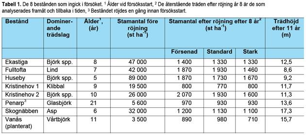 Åtta unga lövskogsbestånd i södra Götaland med röjningsbehov identifierades (Tabell 1). Björk dominerade i fem av beståndet (Figur 1 och 2) men klibbal, asp och lind ingick också i studien.