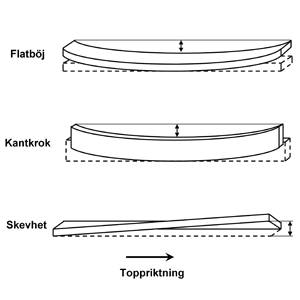 Virket torkades sedan i strölagda paket på sågplanen. Mätningarna var mycket tidsödande och materialet delades upp i två hälfter. I juni 2012 mättes formfelsegenskaper (flatböj, kantkrok och skevhet, se Figur 1) på ena hälften och därefter transport till virkeslaboratoriet på Linnéuniversitet i Växjö för scanning i universitetets WoodEye-utrustning. Scanningen samlade in data om kvistar och defekter (storlek och antal) på centrumutbytets ytsida och två kantsidor. Till sist mättes virkets styvhet genom att mäta dess densitet och dess dynamiska E-modul (modulus of elasticity).
