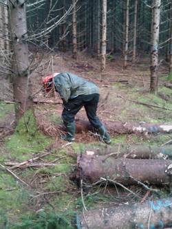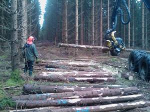 Träden avverkades med skördare i september 2011. Stammarna apterades till 3,2 m längd.