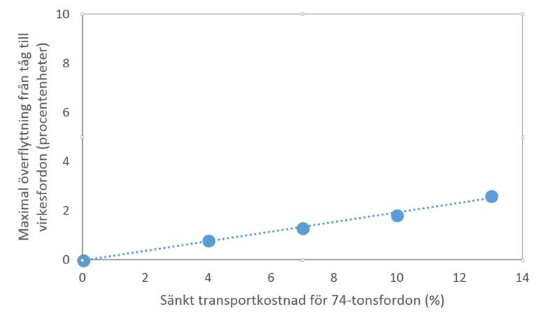 I grundanalysen har ingen hänsyn tagits till olika lastfyllnadsgrader. Den sänkning av transportkostnaden med 13 % som använts i analysen byggde på antagande om att 60- och 74-tonsfordon har samma lastfyllnadsgrad. På grund av att rundvirkets densitet varierar under året blir volymen oftare begränsande för hur mycket ett 74-tonsfordon kan lasta, vilket leder till lägre lastfyllnadsgrad än vad 60-tonsfordonen har. Eftersom lägre lastfyllnadsgrad leder till högre transportkostnad gjordes även en känslighetsanalys av hur olika nivåer av kostnadsminskning påverkar överflyttning från järnväg. Nedan visar figur 2 hur den maximala överflyttningen från tåg till virkesfordon kan förändras beroende på storleken på kostnadsminskningen. Sambandet mellan maximal överflyttningseffekt och minskningen av transportkostnaden var linjärt.