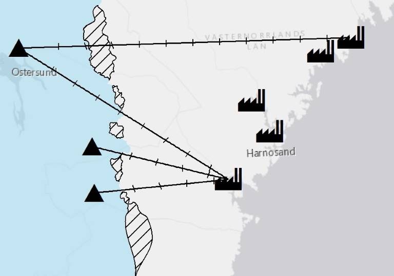 En visualisering av resultatet (figur 1) visar att ett införande av 74-tonsfordon kan göra att direktkörningsgränsen flyttas något till förmån för virkesfordon eftersom transportkostnaden med ett 74-tonsfordon var lägre än med ett 60-tonsfordon.