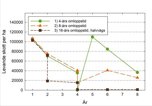 I behandlingsalternativet med fyra års omloppstid kunde vi inte se någon nedgång i tillväxt (Figur 2) eller rotskottuppslag (Figur 1). Visserligen fanns en viss variation efter de olika åren men efter två korta cykler bibehöll hybridaspen sin produktionsförmåga.