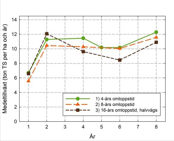 I samtliga behandlingsalternativ kom medelproduktionen av stam- och grenbiomassa snabbt upp i en nivå på omkring 10 ton TS per ha och år (figur 3). Produktionen upprätthölls på den nivån under de åtta år som den inledande studien varade. En viss nedgång kunde ses i behandlingen med 16 års omloppstid på grund av röjning år två med påföljande friställning år fyra, men även i detta alternativ repade sig tillväxten och hamnade på i stort sett samma nivå som de andra behandlingarna efter åtta år.