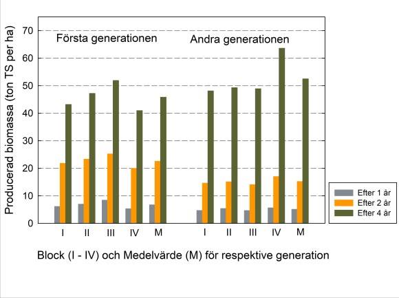 Efter att det ursprungliga planterade beståndet avverkats har man nu kommit halvvägs i studierna av rotskottföryngring. Resultaten hittills visar att mängden rotskott och den biomassa som producerats inte minskat från den första till andra rotskottgenerationen även om omloppstiden bara var fyra år. Samtidigt kunde forskarna se att den totala produktionen av vedbiomassa var tämligen lika under de första åtta åren för de tre omloppstiderna 4, 8 respektive 16 år. I det senare fallet har man ännu inte kommit till slutet av en omloppstid. Medelproduktionen var i samtliga fall kring 10 ton TS ha-1 år-1 och den nivån nåddes på bara ett par år.