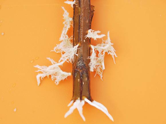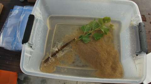 I fuktig sand bildades också rötter längst ned på sticklingen.