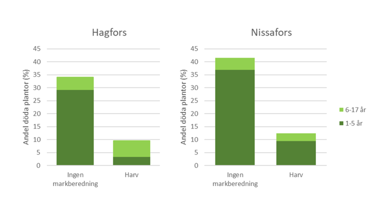 I både Hagfors och Nissafors hade markberedning med harv en positiv effekt på trädens överlevnad. Majoriteten av avgångarna skedde under etableringsfasen, det vill säga de första fem åren efter plantering. Effekterna av harvningen låg sedan fast och endast några få procent av träden dog fram till år 17 (Figur 2).