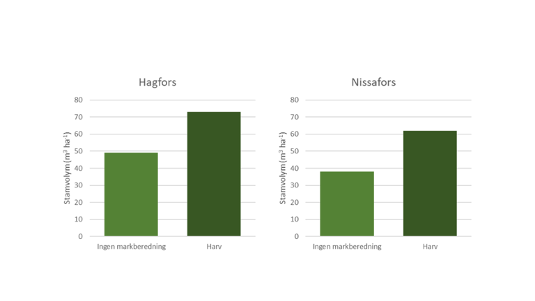 Figur 3. Stamvolym per hektar för träd planterade utan markberedning och efter harvning i Hagfors och Nissafors.