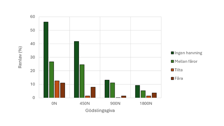 Tidigare kvävegödsling hade inte någon effekt på trädens utveckling i den efterföljande generationen, men påverkade delvis markvegetationen. I Hagfors var det tydligt att harvning påverkade förekomsten av renlav negativt och att renlaven ersattes av ljung på de harvade ytorna. Renlaven påverkades också negativt av tidigare gödsling, ju mer kväve per hektar som tillfördes desto mer minskade renlavstäcket (Figur 4). I Nissafors orsakade harvningen ett skifte i artsammansättningen från att domineras av lingon till att få en större inblandning av blåbär.