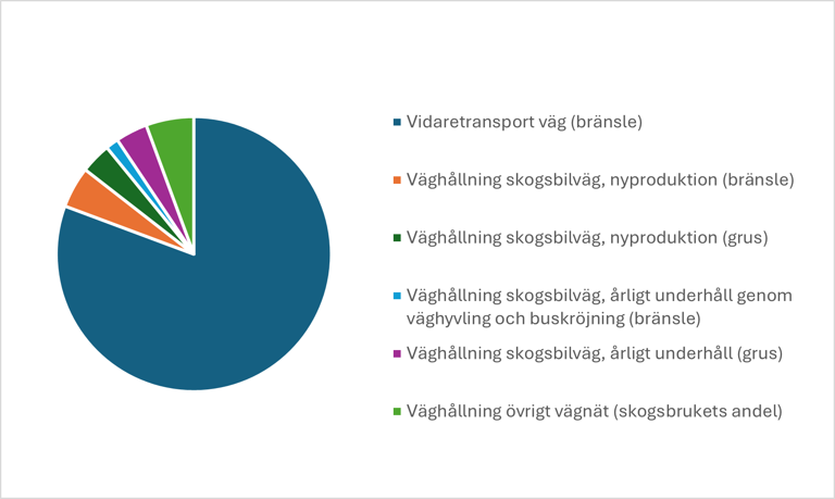 Vidaretransport av skogsbiomassa utgör 56 % av de totala utsläppen. Bränsleanvändningen vid vägtransporterna står för majoriteten av dessa utsläpp, medan väghållning, både nybyggnation och årligt underhåll, bidrar med en mindre men inte obetydlig del (figur 1). Såväl skogsbilvägar som skogsbrukets användning av det statliga vägnätet ingår i beräkningarna. Drivningen står för 38 % av de totala utsläppen och den största posten här är bränsleförbrukningen i skördare och skotare (figur 2). Slutavverkning genererar störst utsläpp, följt av gallring. Skogsvården bidrar med ca 6 % av de totala utsläppen. Plantproduktionen är den enskilt största posten, följt av markberedningen (figur 3).