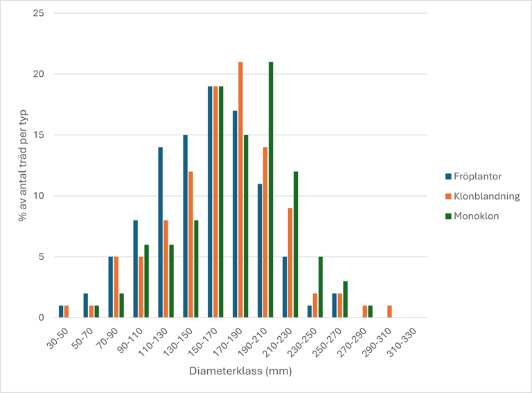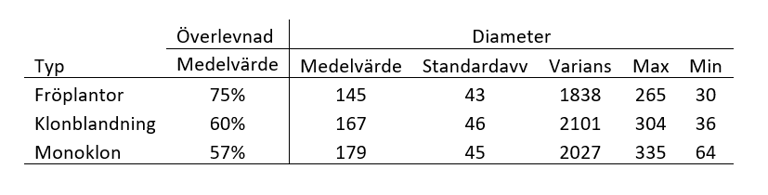 Den variation som finns i diameter mellan de tre sorterna skiljer sig inte och alla uppvisar dessutom en normalfördelningsliknande distribution av diameterklasser, dock med olika medelvärden. De inmätta skadorna är ytterst få och inga skillnader går att utläsa från dessa. Resultaten överensstämmer med en tidigare studie som inte såg några signifikanta skillnader i standardavvikelse för vare sig höjd eller diameter mellan monoklonytor och fröplantsytor. Resultaten styrks också indirekt av att den övervägande delen av ett träds fenotypiska variation i tillväxt beror av miljön och endast en mindre del av variationen är genetiskt styrd.