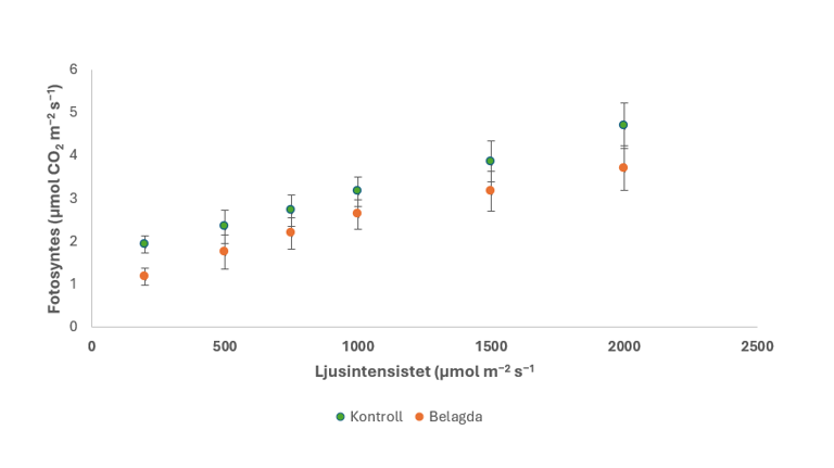 Figur 1. Ljusresponskurva för tall hösten 2020 (a) och våren 2021 (b) för obelagda kontrollbarr samt belagda barr, n=5. Felstaplar avser standardavvikelse.