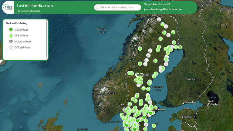 Idag finns ingen enkel öppen lösning som hjälper transportköpare, transportplanerare eller lastbilsförare att hitta laddstationer specifikt anpassade för lastbilar i Sverige. Givet att laddningen är en så viktig del i elektrifieringen, och att det idag saknas lastbilsspecifika verktyg, har TREE-projektet tagit fram Lastbilsladdkartan. Det är en karttjänst som kan användas för att lätt få en överblick av laddstationer anpassade för lastbilar. Kartan visar laddstationer som antingen har byggts specifikt för lastbilar, alternativt snabbladdare för personbilar där det finns tillräckligt stor yta för lastbilar att komma intill och ladda. Lastbilsladdkartan baserar sig på öppna data som successivt kommer att kompletteras med input från projektpartners i TREE-projektet och observationer från platserna. Förutom laddeffekt kan man också se om stationen är driftsatt eller under uppbyggnad.