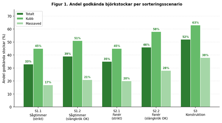 Figur 1. Andel godkända björkstockar (%) per sorteringsscenario och stockkategori. Kubbstockar (apterade som möjliga sågstockar) når 45–63 % godkännandegrad beroende på scenario, jämfört med 17–38 % för massavedsstockar. Krav på konstruktionsvirke (S3) ger den högsta godkännandegraden.