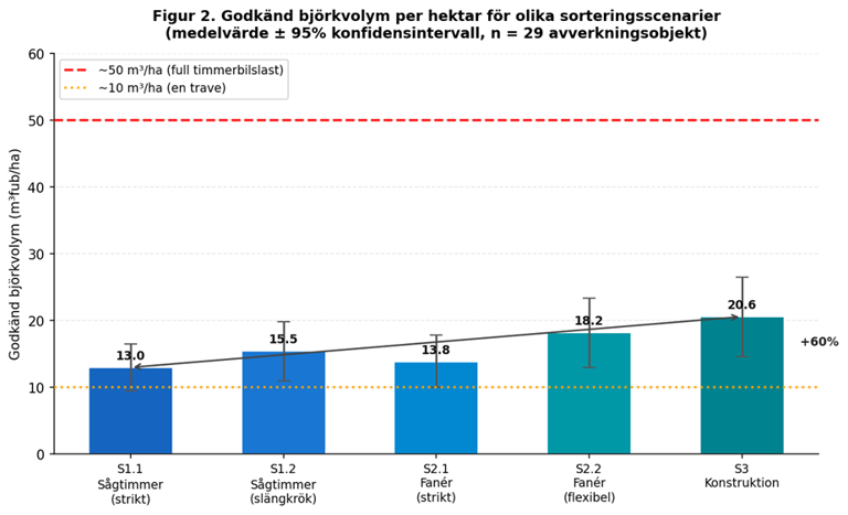 Figur 2. Godkänd björkvolym per hektar (m³fub/ha) för fem sorteringsscenarier, baserat på 29 avverkningsobjekt i Götaland. Medelvärde och 95% konfidensintervall visas. Den röda streckade linjen markerar tröskeln för en full timmerbilslast (~50 m³), den orange prickade linjen en trave (~10 m³). Konstruktionsscenariot (S3) ger en volymökning på cirka 60% jämfört med det striktaste sågtimmerscenariot (S1.1).