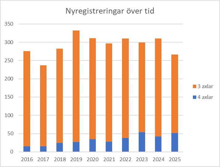 Figur 1. Antalet nyregistrerade timmerbilar per år, samt andelen med tre respektive fyra axlar. År 2025 registrerades totalt 266 timmerbilar, varav 80 % hade tre axlar.