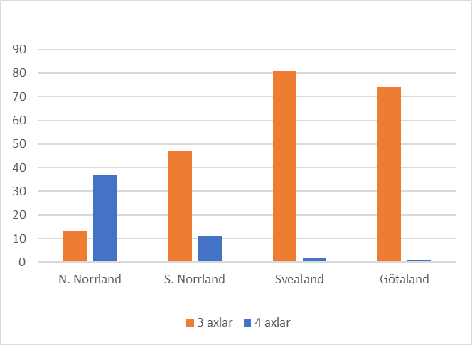 I norra Norrland slog de fyraxliga bilarna igenom stort under 2025 (figur 2), medan de fortfarande är mindre vanliga i Svealand och Götaland. Skillnaden beror antagligen till stor del på tillgången på BK4-klassat vägnät, som är större i de nordliga länen.