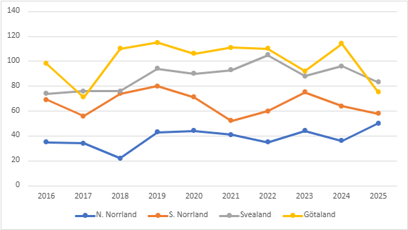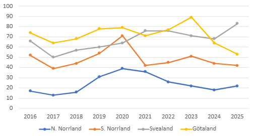 Antalet registrerade timmersläp per år är relativt stabila i både norra och södra Norrland (figur 6). I Götaland ser vi däremot en minskning 2025 jämfört med tidigare år.