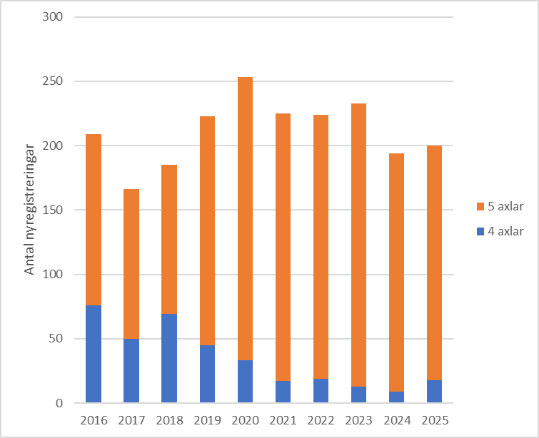 Figur 4. Nyregistrerade timmersläp 2025 fördelat på 4 eller 5 axlar.
