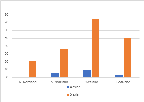 Figur 5. Timmersläp registrerade 2025 per landsdel fördelat på 4 eller 5 axlar. Antalet var i N Norrland: 22 vagnar, varav 1 fyraxlig; i S Norrland 42 vagnar, varav 5 fyraxliga; i Svealand 83 vagnar, varav 9 fyraxliga och i Götaland: 53 vagnar, varav 3 fyraxliga.