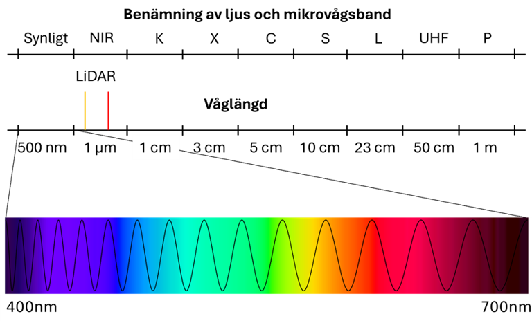 Figur 2. Några utvalda våglängdsområden och deras benämningar och relation till varandra.