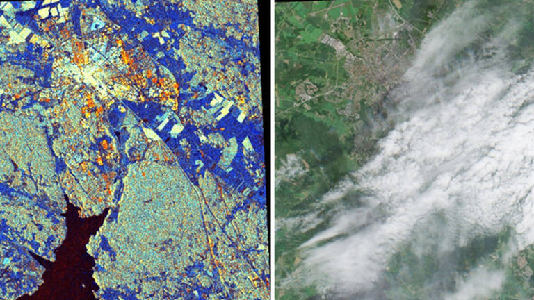 Figur 1. Demonstration av Copernicus satellitbilder över Uppsala den 11 juli 2025. Vänster: Radarbild från Sentinel-1 (false-color composite av bakåtspridning representerad som gamma0, med VV polarisationen i röd kanal, VH i grön och kvoten VH/VV i blå). Höger: Radarbild från Sentinel-2 (true-color composite med band 4 i röd kanal, band 3 i grön och band 2 i blå).