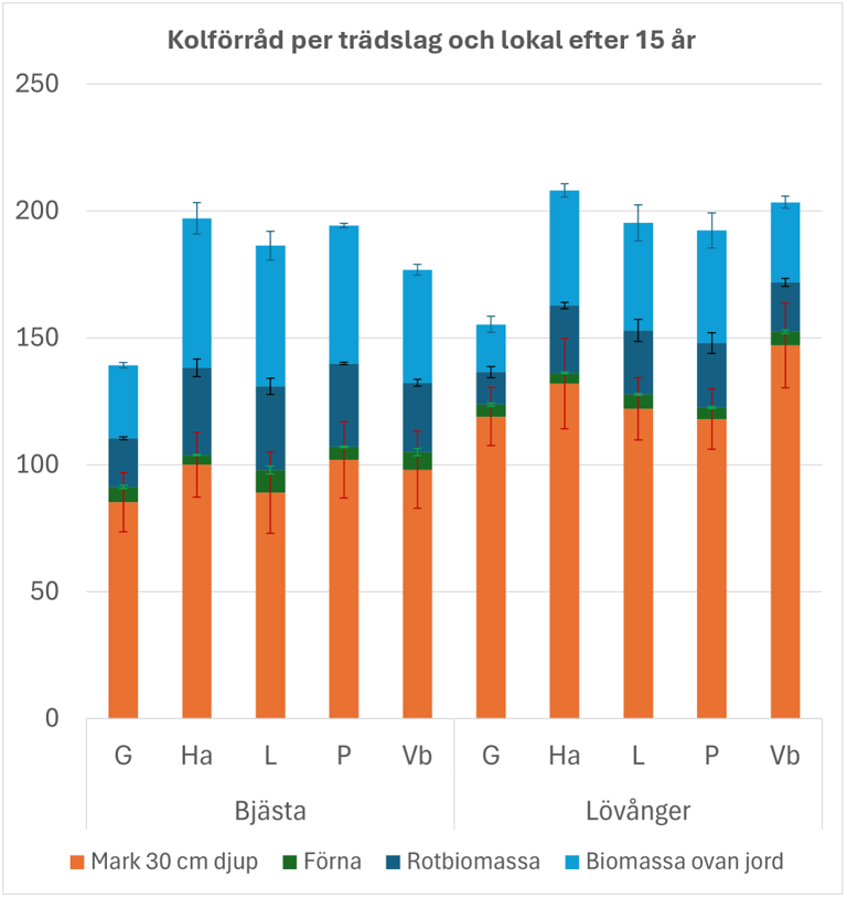 Figur 1. Totalt kolförråd (ton kol per hektar) i mark (0–30 cm), förna, rotbiomassa och ovanjordisk biomassa för respektive trädslag i de två försökslokalerna (Bjästa och Lövånger). G=gran, Ha=hybridasp, L=lärk, P=poppel, Vb=vårtbjörk. Felstaplarna motsvarar ett medelfel.