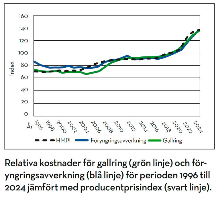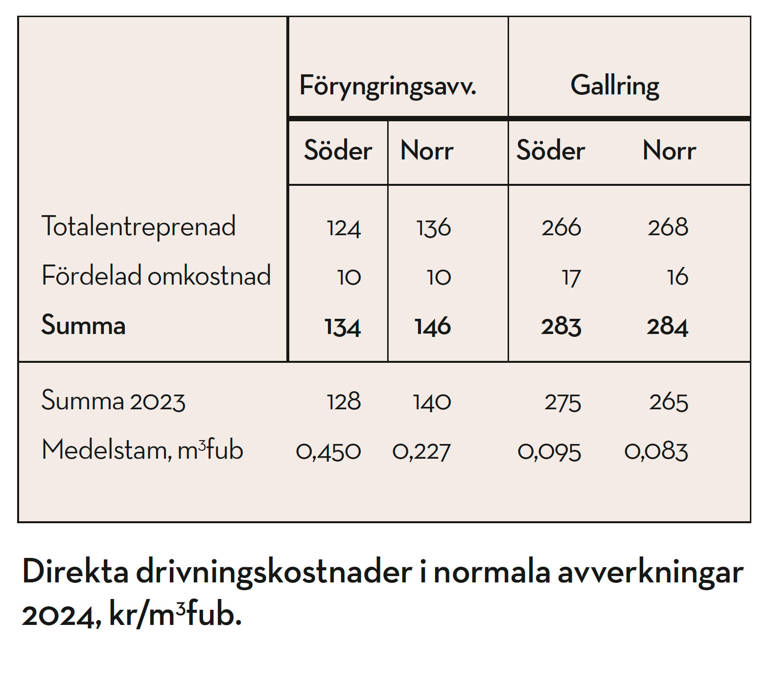 Kostnader samlas även in för hyggesfritt skogsbruk. Antalet svarande är fortsatt lågt varför endast medeltal för hela landet gått att ta fram. Totalt särredovisades kostnaden för avverkning med hyggesfria metoder för 1,1 procent av den avverkade volymen. Drivningskostnaden per m3fub i hyggesfritt skogsbruk ökade med 11 procent till 232 kr per kubikmeter 2023. Spridningen i kostnad är fortsatt stor och medelvärdet finns i spannet 182–273 kr per m3fub. Av detta var 24 kr per m3fub fördelade omkostnader (till exempel flyttkostnader).