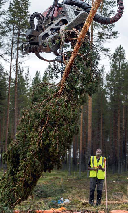 Vägning av grot med hjälp av en våg fäst på skördaraggregatet. Hagos Lundström, Skogforsk styr vågen på behörigt avstånd.