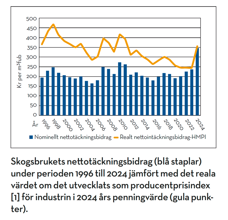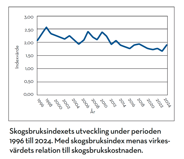 Skogsbruksindex för 2024 ökade med drygt 0,2 index enheter jämfört med 2023, och bröt därmed den negativa trenden. Det nominella täckningsbidraget efter skogsbrukskostnader har ökat med nästan 47 procent sedan 2023.