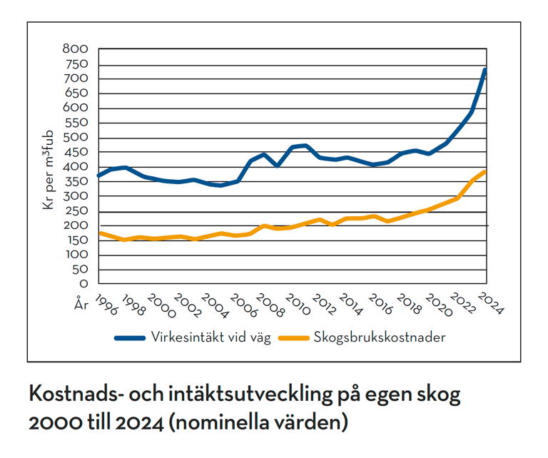Under 2024 ökade den genomsnittliga virkesintäkten vid väg med 24,6 procent till 732 kr per m3fub. Samtidigt ökade skogsbrukskostnaderna på det egna skogsinnehavet med 9,5 procent.