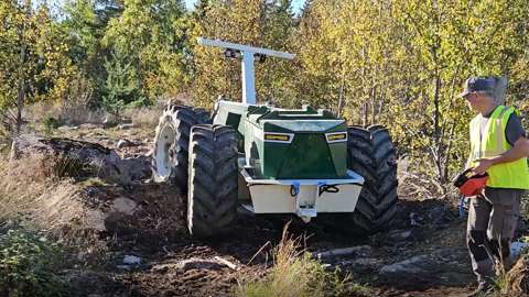 Skogforsk har testat en elektrisk fjärrstyrd och autonom traktor, Drever 120, vid Troëdsson Forestry Teleoperation Lab i Jälla. Maskinens energiförbrukning samt framkomlighet i terräng studerades.