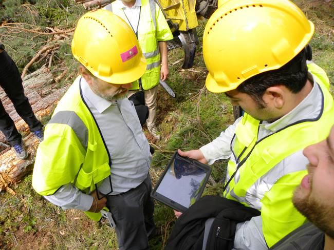 Hans Grosse och Rodrigo Mujica visas planeringsverktyget Bestway som Skogforsk utvecklat.