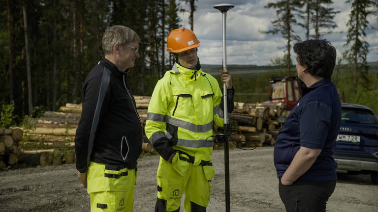 Precision i skogen: Skördaren använder RTK-GNSS (Real-Time Kinematic) för mycket noggrann positionsbestämning av stocken. När trädet kapas får varje stock en exakt koordinat kopplad till stockens digitrala ID och till skördarens mätdata. Informationen lagras i molnet.