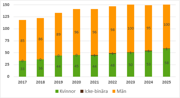 Då vi jämför Skogforsk med resten av skogsnäringen har Skogforsk en hyfsat jämn könsfördelning, 38 % kvinnor jämfört med 11 % i hela näringen. Vår Ledningsgrupp har en jämn fördelning: 5 kvinnor och 6 män.
