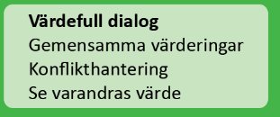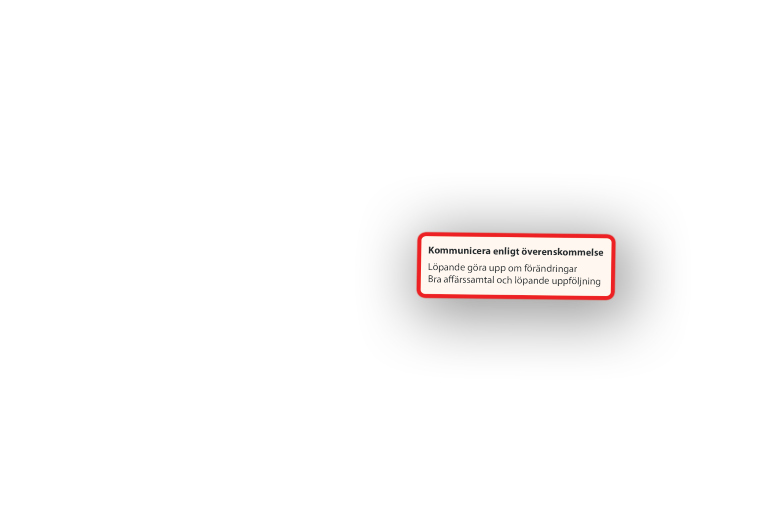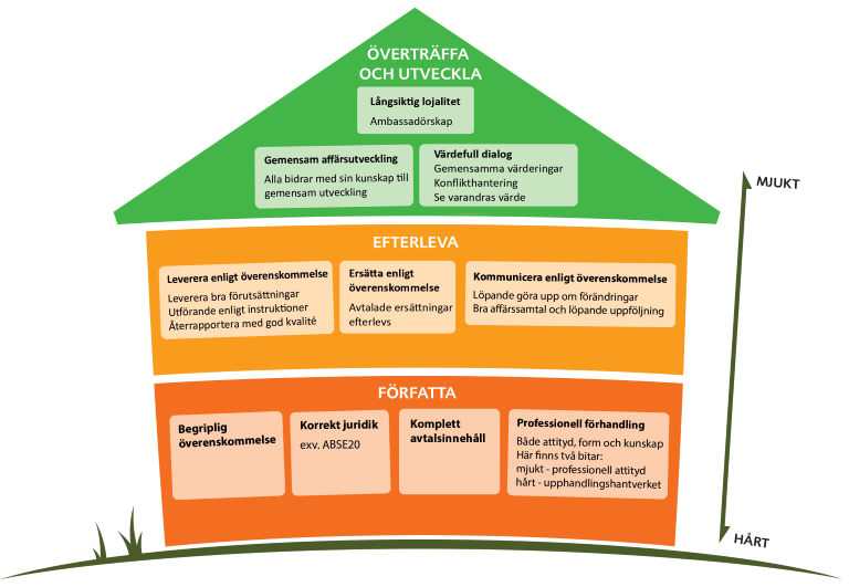 Våningarna illustrerar hårdare och mjukare typer av byggstenar – Författa, Efterleva och Överträffa & utveckla – som behöver vara på plats för att relationen och därmed verksamheten, ska fungera väl.