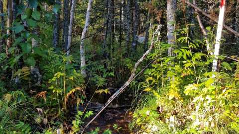 Fem bäckar ingår i studien. I dessa tar vi vattenprov och mäter vattentemperatur och ljusinstrålning över bäcken, totalt sex gånger per år. Här är provtagningspunkten för bäck nr 1