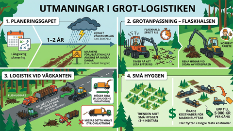 - Markskydd före maxvolym: Grot används som körunderlag för att minska markskador, så en del lämnas kvar.